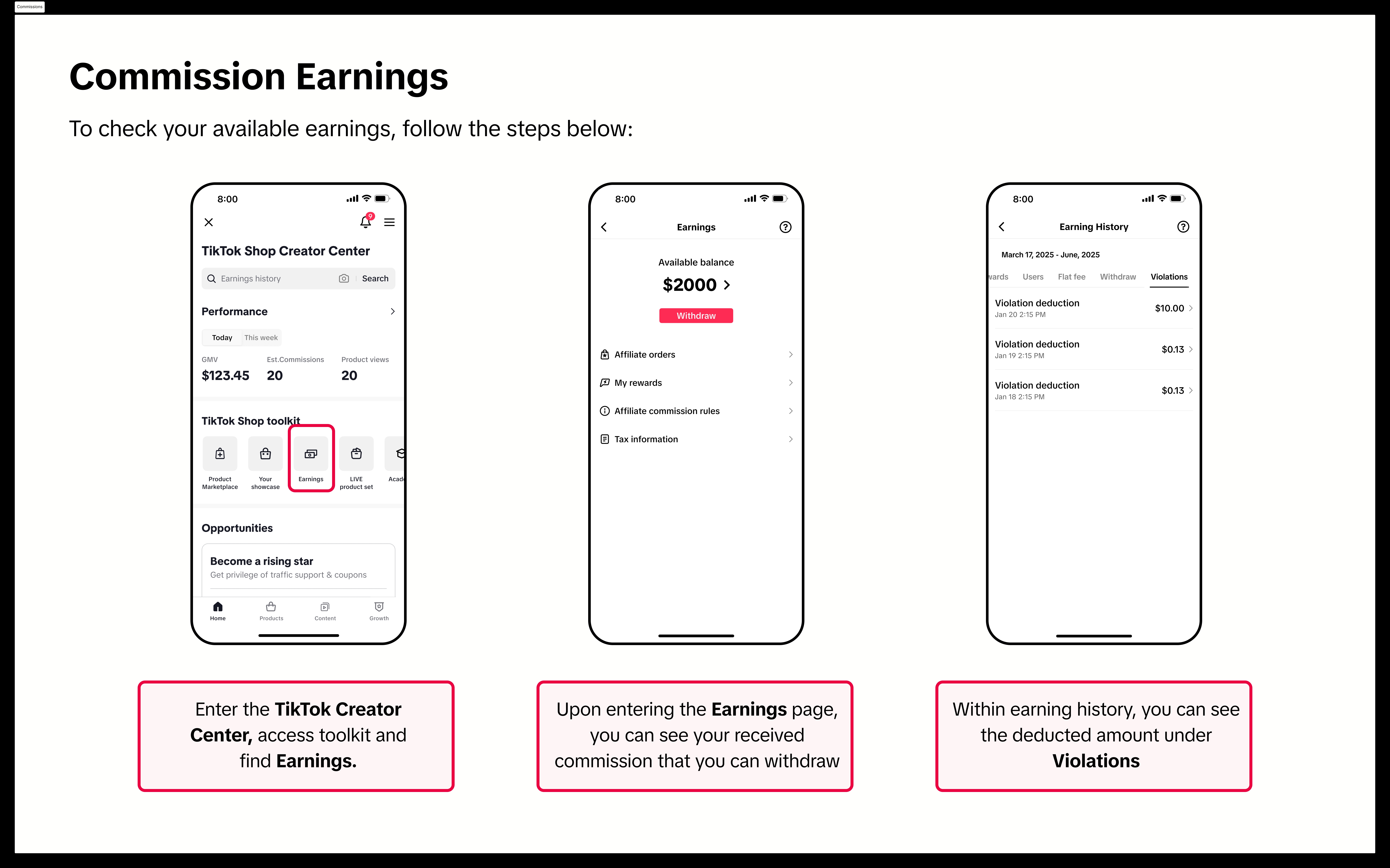 如需查看被扣金额,请打开 TikTok Studio> 工具 > 收益 > 余额 > 收益历史。然后,您可以在违规记录下查看被扣佣金金额。​